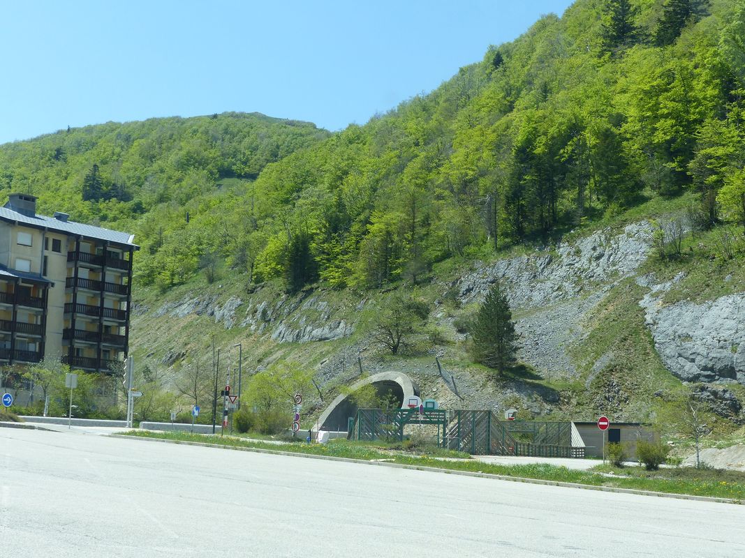 Carte de cette boucle (boucle des Coulmes) La route dessine ses lacets dans la pente sélevant progressivement au dessus des gorges de la Bourne dans une ambiance d'abord agricole. Elle offre un resserrement inattendu en traversant le magnifique hameau des Nugues avant d'arriver sur le fameux belvédère du col de Toutes Aures où une pause aurait permis une vision panoramique vers le sud du Vercors et la plaine de l'Isère sans la brume !. En se rapprochant des fameuses falaises de Presles, la route n'a pas d'autre choix que de traverser en double parenthèse le calcaire urgonien dans un tunnel étroit dont les percées tels des hublots offrent une vision furtive sur la grande Cournouze en face. |