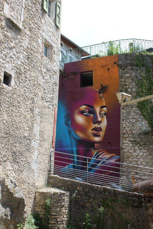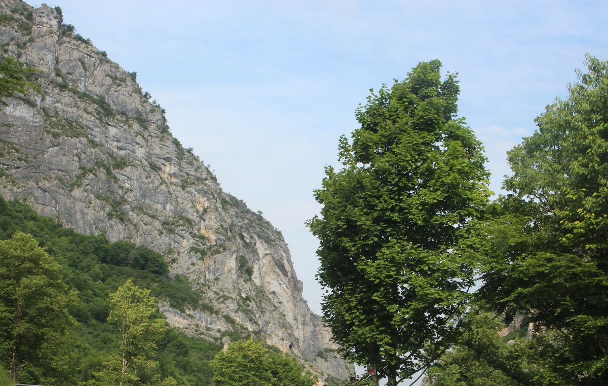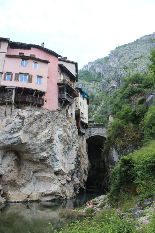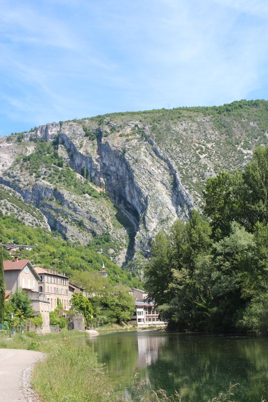 et pas très aérée !. Le camping de Pont-en-Royans nous accueille au frais sous les arbres sur les rives de la Bourne. ( 45.0616, 5.3331) Très bien rénové 18€ tout compris!). On va faire une petite virée vers la ville en suivant les berges de la rivière envahies par les familles venues faire un pique-nique et se rafraîchir. On aura marché 5,8km au total ! |