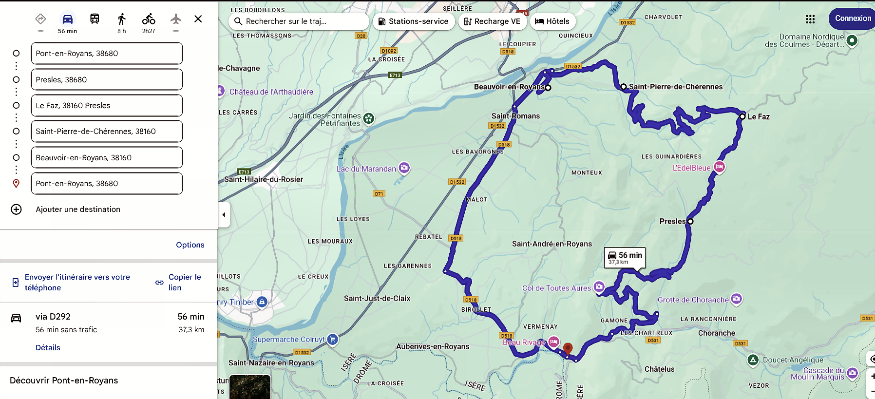| On se posera à laire de camping-car de Pont-en-Royans (45.0632, 5.3358 « Aux Priolées « avec lélectricité 12€ et pour leau potable cest 1 € de plus ). A lombre et à côté de la Bourne. | ||