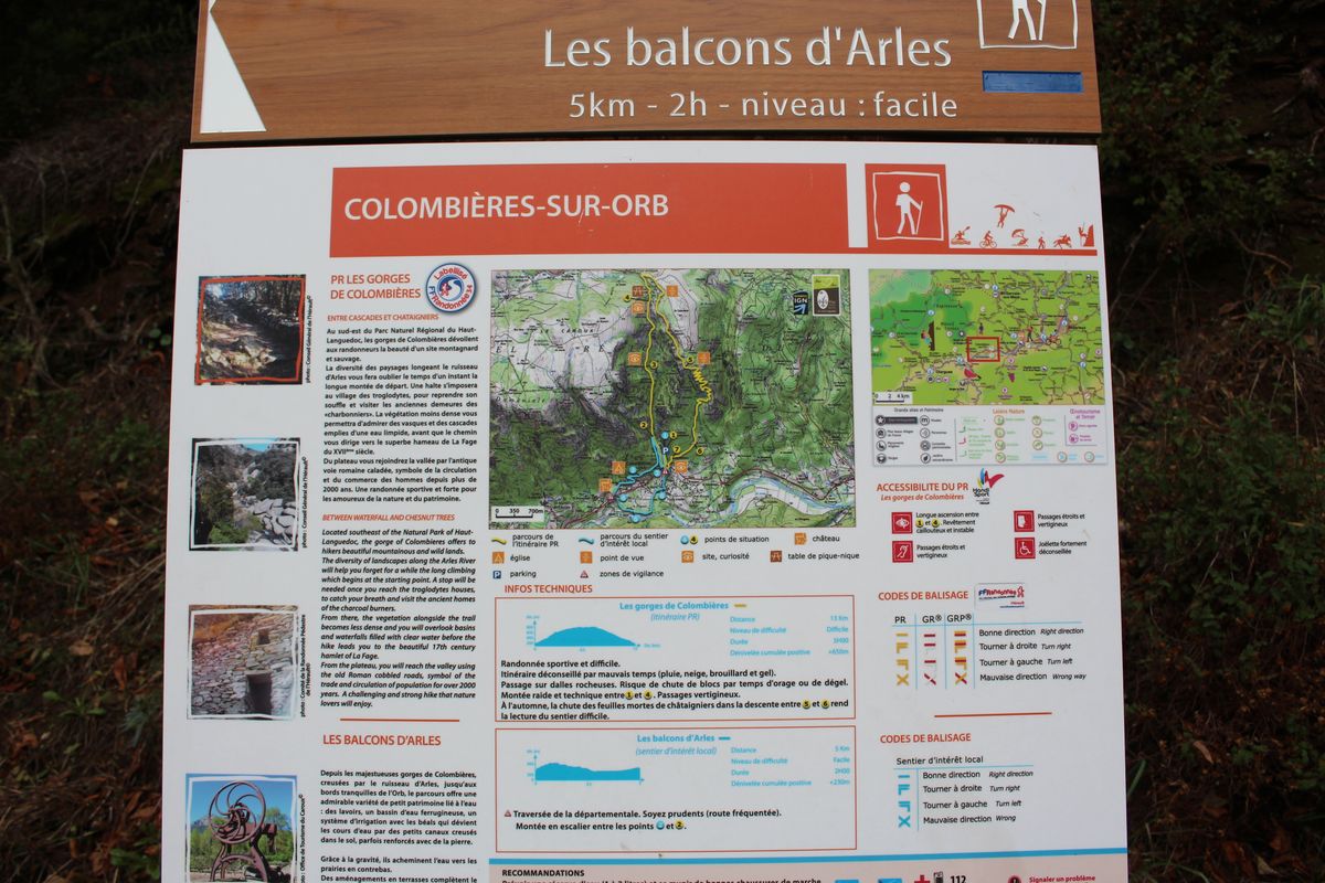 et le plan au format PDF est ICI 6 kilomètres qui nous permettent de découvrir le village sous un nouveau jour. Après avoir gravi les marches (départ commun avec un autre PR) à la sortie du parking nous cheminons sur les hauteurs de Colombières. La piste est large et agréable. Une rapide descente dans les rues nous fait traverser la départementale 908. Mais avant, après avoir contouné le châtau (gîte de charme) nous montons jusqu'à la tour carrée en ruine et en rénovation) . En descendant vers l'Orb, nous traversons la voie verte Passa-Païs et attaquons un sentier entre les anciens jardins du village. A l'ancienne gare, direction plein nord pour retrouver rapidement le parking. |