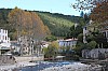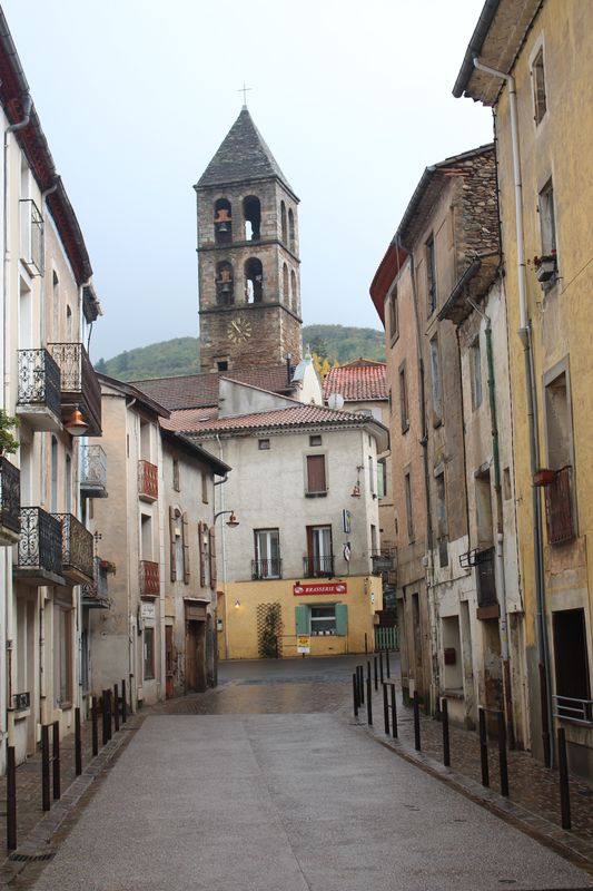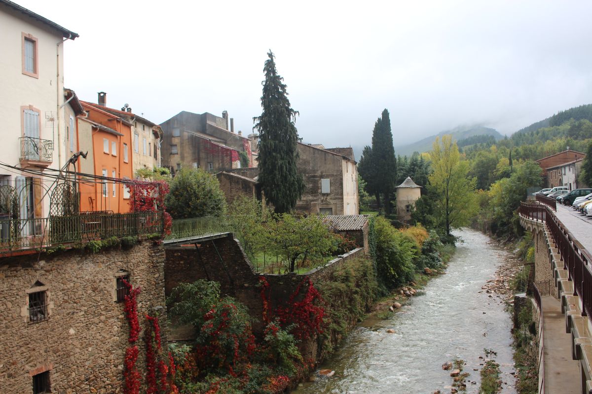 | Mardi 25 octobre Je fais les services pendant que Isa fait sa cure ! J'ai fait bien plus vite qu'Isa sous la bruine. 13 h nous partons nous promener en voiture, il bruine et fait des averses...... On visite Villemagne-L'Argentière, son hôtel des monnaies, ses églises, son abbaye, la Mare est bien haute Le Pont du diable construit sur la Mare afin de faire passer les charroies de charbon pour alimenter les fonderies d'Hérépian, on ne le verra pas de face c'est trop glissant pour descendre au bord de l'eau...De l'autre côté l'accés est bloqué ! |