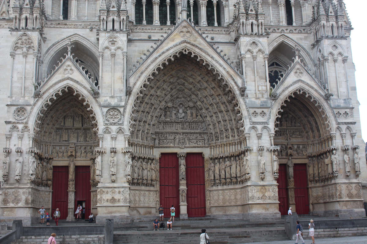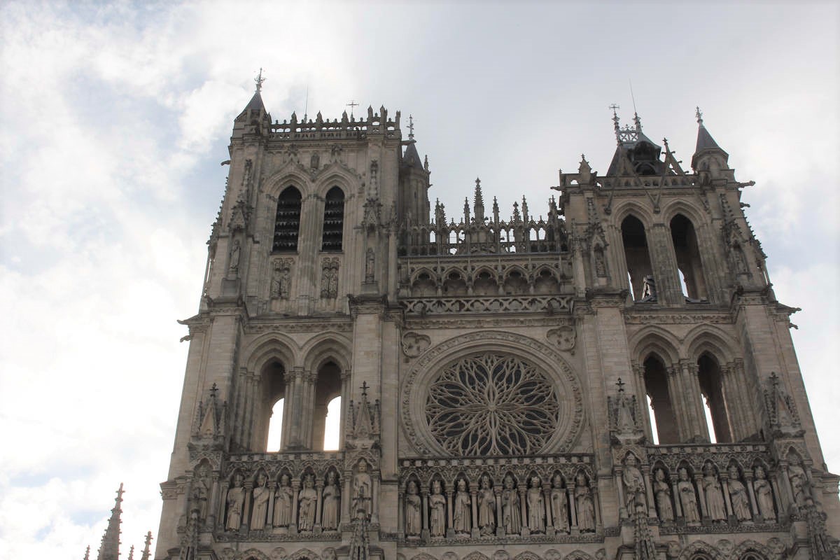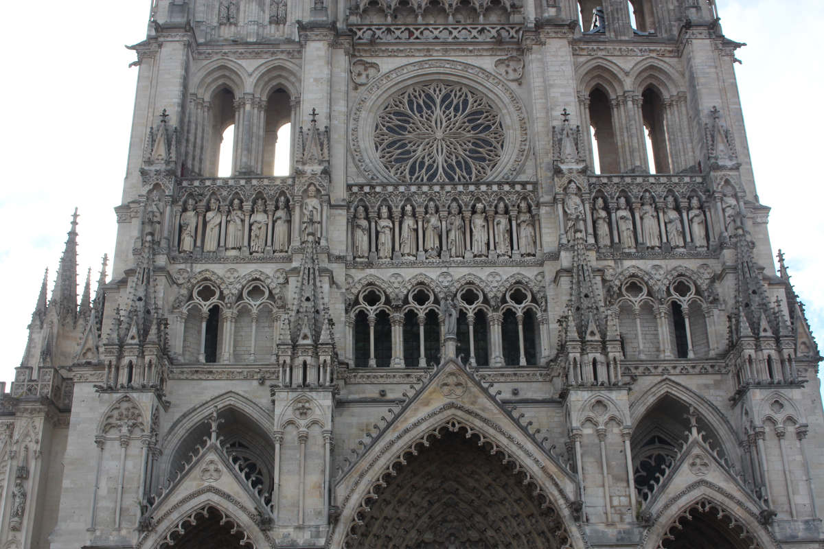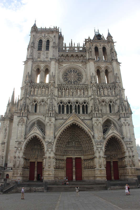 | À lentrée, chacun des trois portails porte le nom du personnage principal sculpté au trumeau : à gauche, saint Firmin, au centre, le beau Dieu, à droite, la mère Dieu. Le niveau supérieur arbore une grande rose occidentale de 13 mètres de diamètre ce qui correspond à la largeur de la nef. |