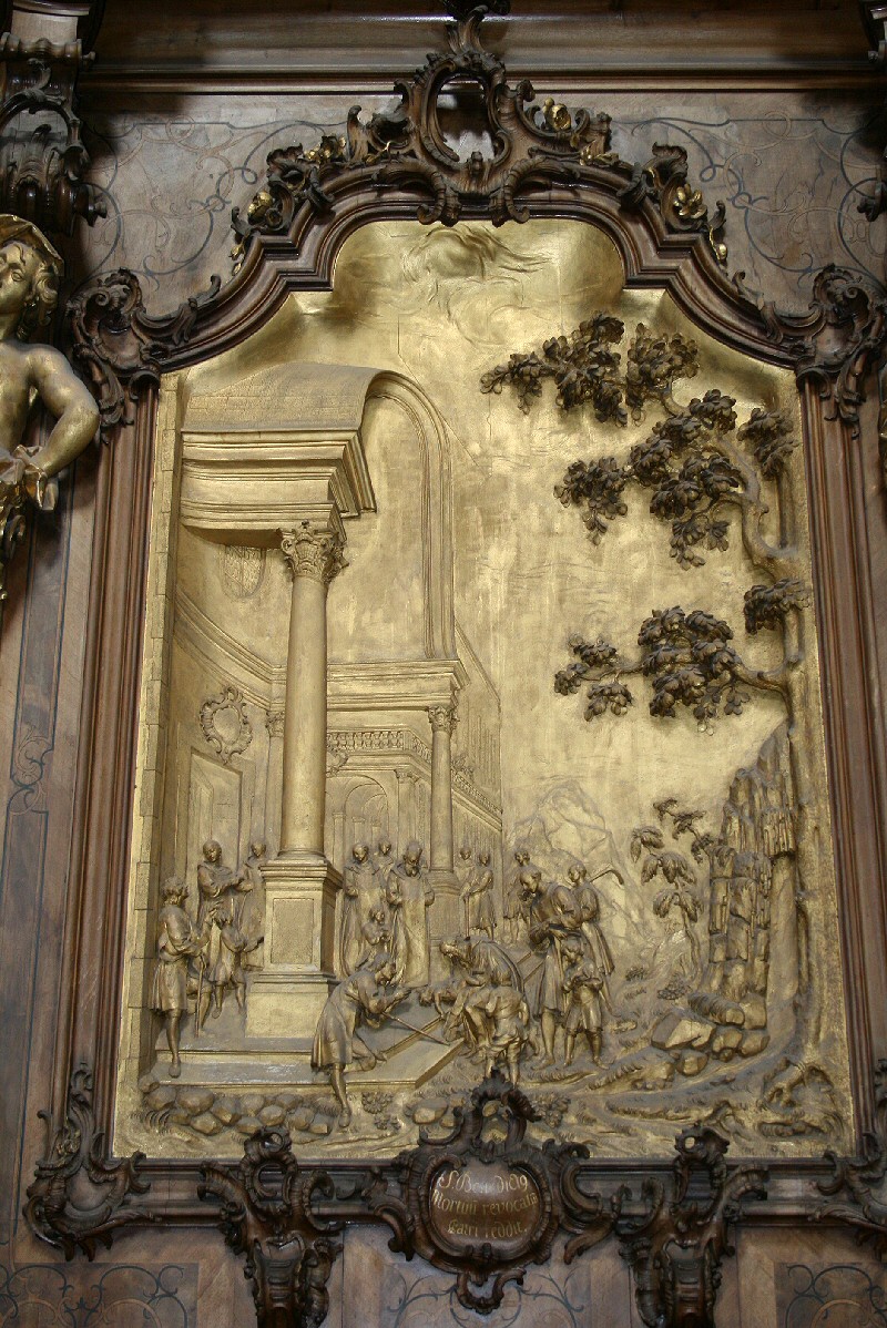 positions. La chaire et le groupe du baptême sont de magnifiques oeuvres d'art en marbre rouge et gris réalisées par Zeiller. Les stalles de noyer représentent un chef-d'oeuvre de l'art et de la sculpture sur bois. Leurs grands dossiers sont décorés de bas reliefs dorés, sur bois de tilleul, dus à Joseph Christian (scènes de la vie de St-Benoît d'un côté et de l'ancien testament de l'autre. |