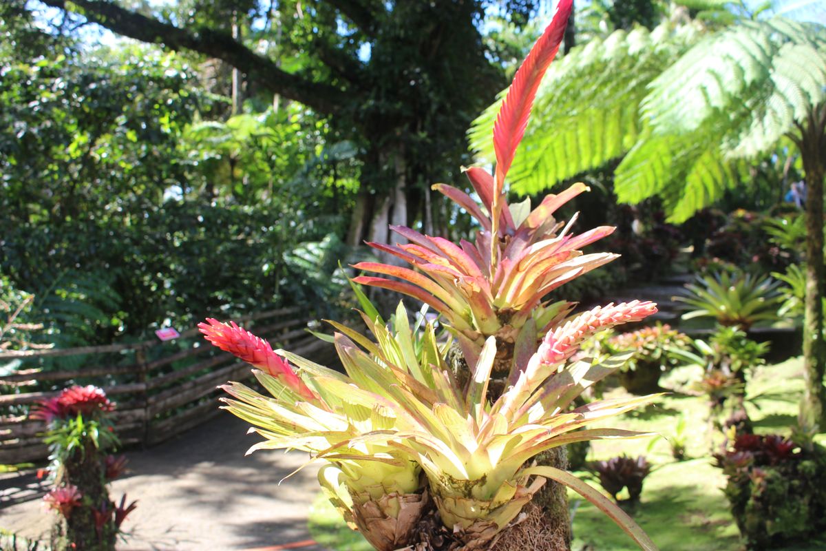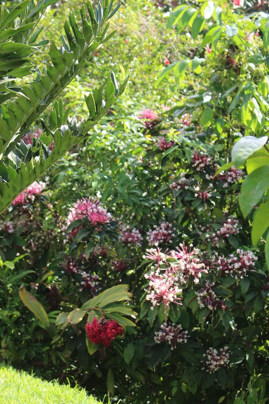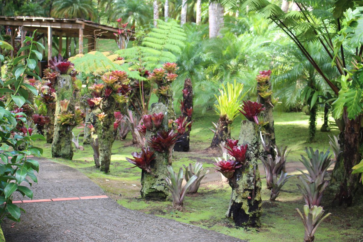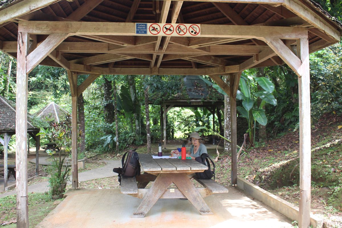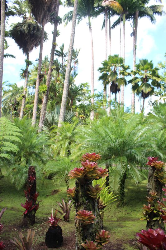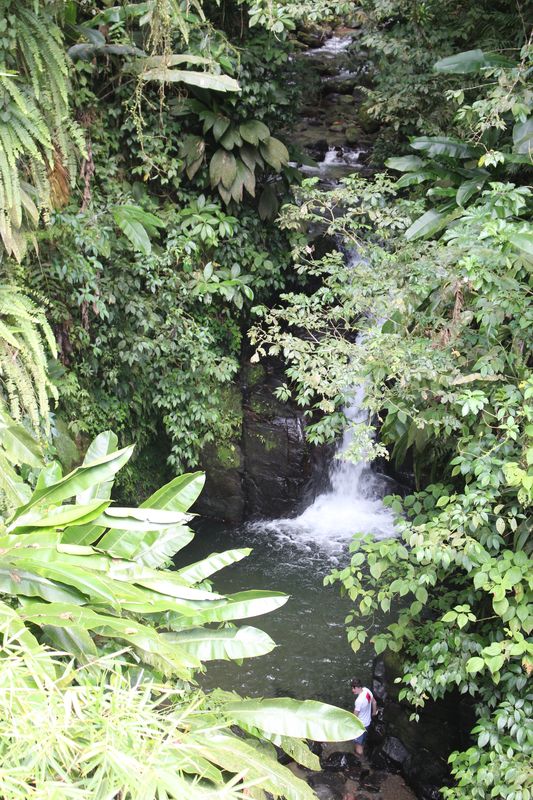 Départ 9h pour les JARDINS de BALATA via Fort de France et la N3. Nous ne sommes pas les premiers : les parkings sont pleins et les bords de la route bien occupés. On se gare à 800 m de lentrée en bord de route. Jardins surtout arborés avec un passage pittoresque sur une passerelle au dessus de la canopée, peu de fleurs. A part un petit restaurant bondé, il ny a rien de prévu pour pique niquer sur le site, nous irons à 2 km vers Saint-Pierre sur le petit parking dun Arborétum. Un natif du coin nous dit daller voir la cascade DABSALON. On la verra du pont ! Les escaliers raides et moussus qui y descendaient nous ont découragés. |