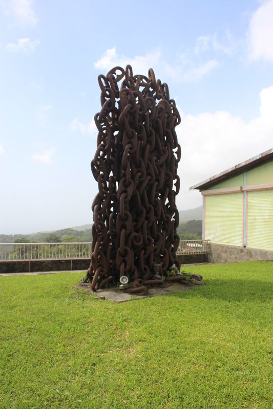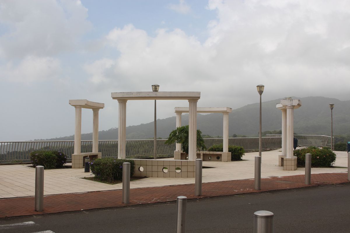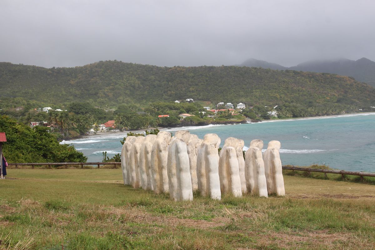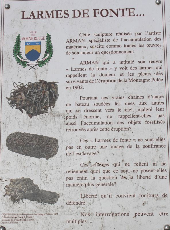 MORNE ROUGE, la plus haute commune de Martinique. Les vues vers le côté atlantique auraient pu être superbes sans la brume ! Belle sculpture dArman : « les Larmes du Volcan » face à la mer. |