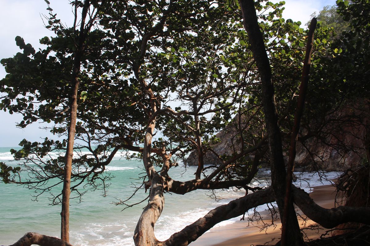 chemin totalement defoncé !. Nous ferons la randonnée de la Savane Pétrifiée via la pointe dEnfer jusquà l Anse Trabaud : 8km aller-retour. Nous avons eu du mal à traverser la rivière sur les cailloux, le pont est trop court !!!, jai glissé sur une pierre je me suis fais une belle grosse égratignure sur la jambe. On pique nique sous les arbres en bordure de plage, puis on étend nos serviettes mais le soleil et le sable sont brûlants ! On rentre. |