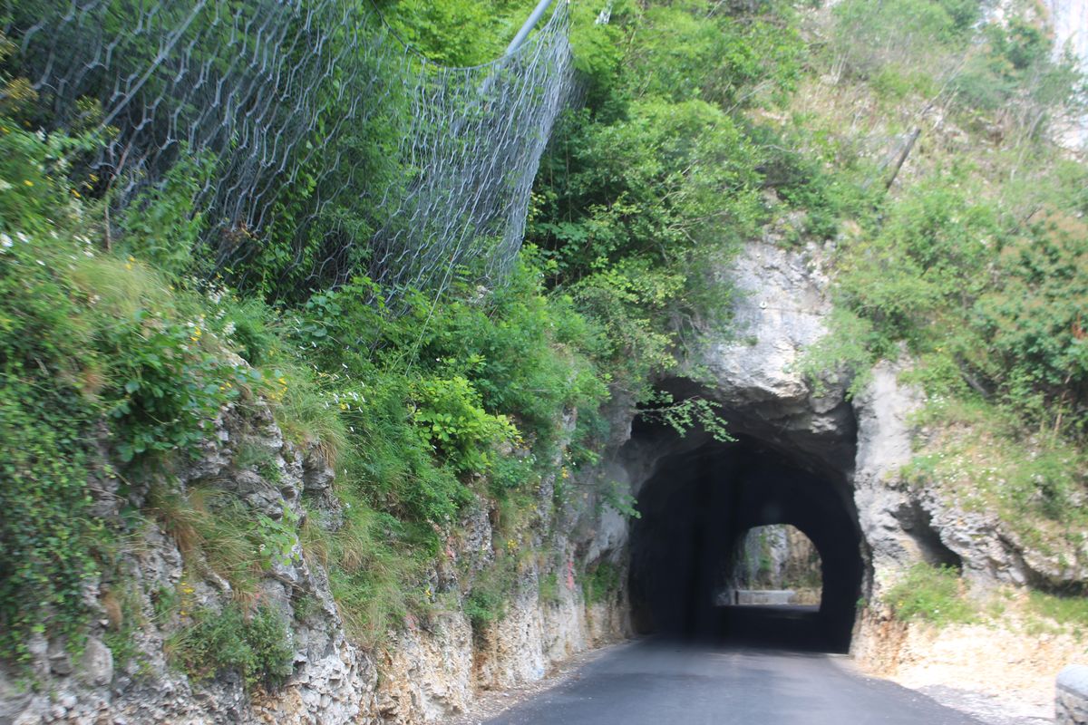 sur la très pittoresque et spectaculaire route de La Combe Laval avec ses tunnels construits dans le rocher, ses passages dans le vide, ses belvédères majestueux qui offrent de splendides points de vues sur le Royannais ! On a croisé deux voitures et beaucoup de motards. |