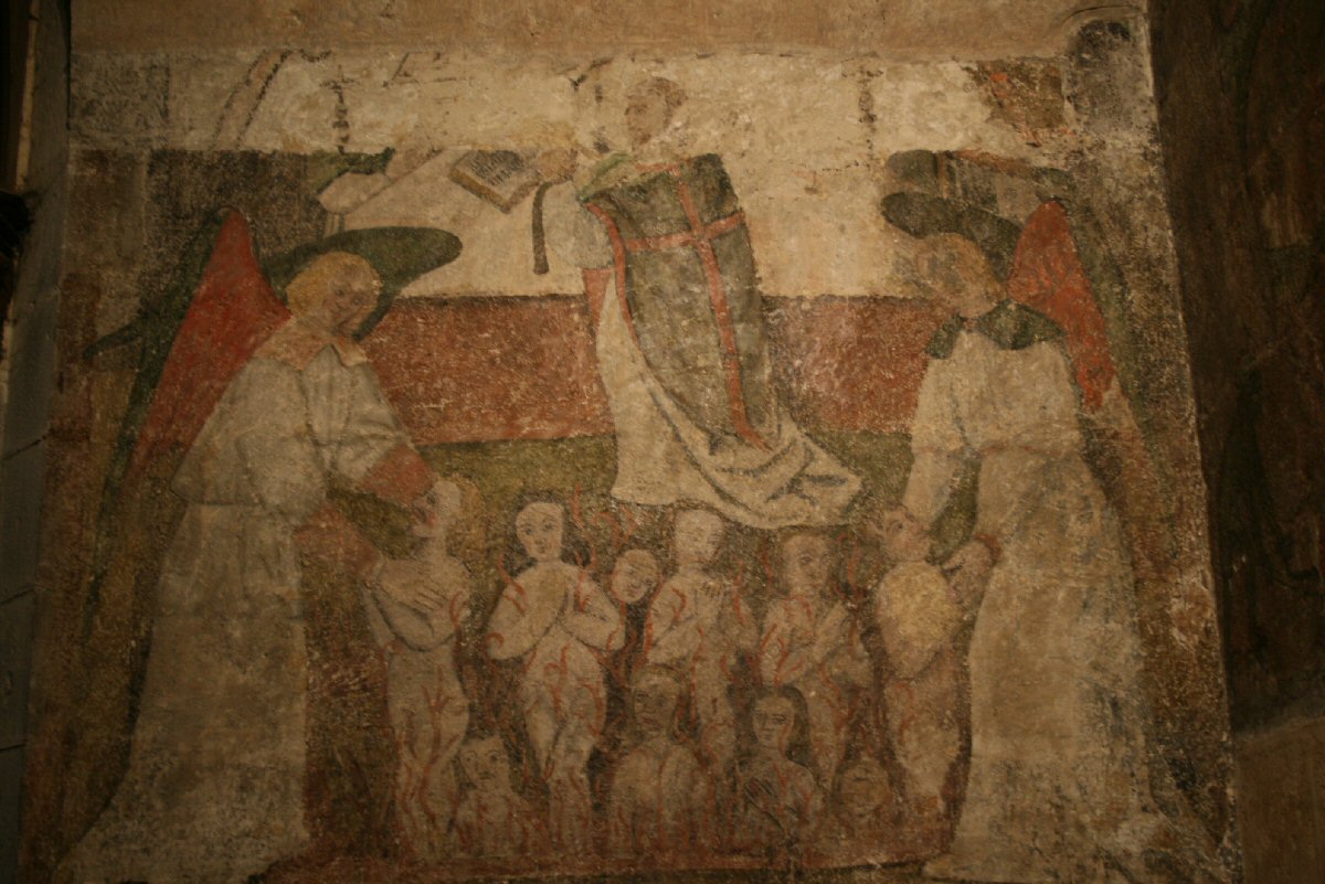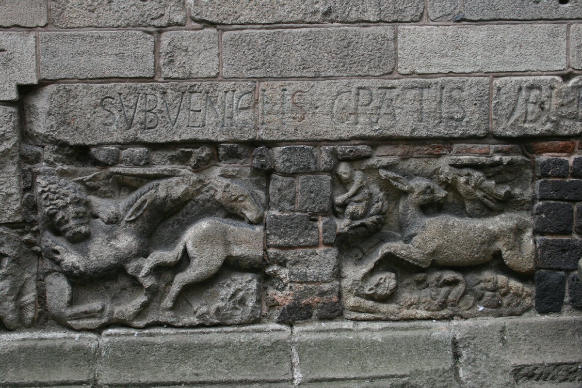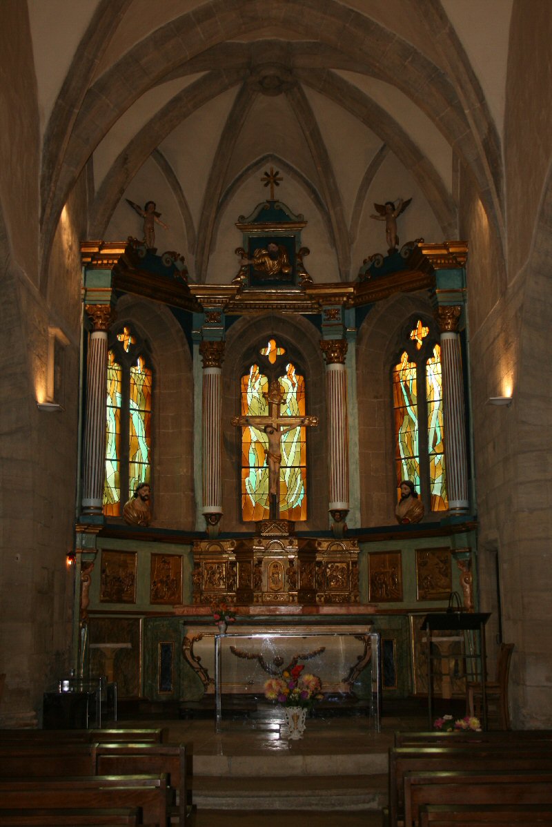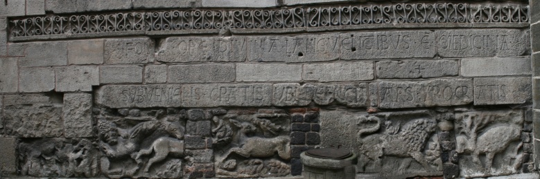 | Derrière l'abside, entre la sacristie et le clocher, la petite cour de la prévôté renferme un puits du Moyen Age, auquel se rapporte une inscription latine gravée sur le mur de chevet: "Par la grâce divine, cette fontaine est pour les malades un remède suppléant gratuitement aux déficiences de l'art d'Hippocrate". Sous cette inscription, des fragments de bas-reliefs gallo-romains, provenant d'un grand édifice, ont été encastrés dans les assises inférieures du chevet: ils représentent Hercule, des scènes de chasse et des combats d'animaux. | |||||