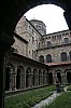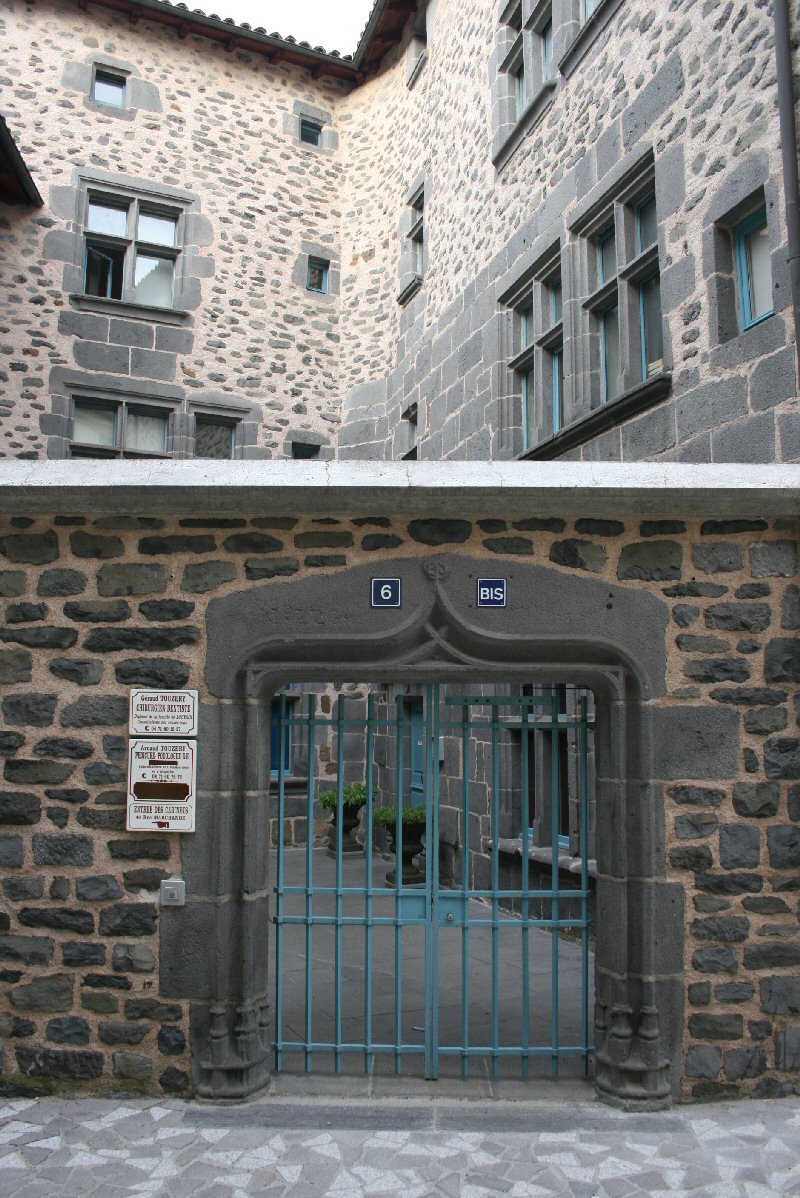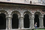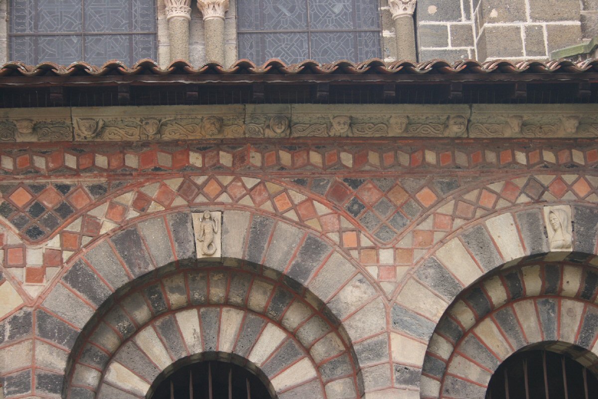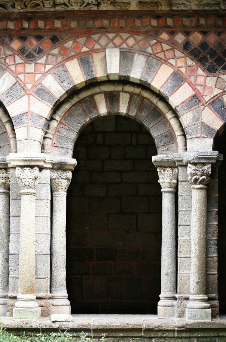 Viollet-le-Duc et Mallay. On ne peut s'empêcher d'évoquer l'architecture arabe en Espagne lorsqu'on voit cette mosaïque polychrome de losanges rouges, ocre, blancs ou noirs qui décore ses arcs. Ici, la lave calcinée se marie au grès blanc. Les galeries prennent jour sur le préau au moyen de grandes arcades en plein cintre reposant sur des piliers carrés, dont les quatre côtés sont garnis de colonnes monolithes dégagées. Celles placées sur les faces latérales des piliers supportent un deuxième arc s'insérant sous les arcades, tandis que celles de l'intérieur servent d'appui aux voûtes des galeries. On compte cinq arcades au nord et au sud, et dix sur les deux autres côtés. On remarque également l'influence hispano-mauresque à travers la cheminée romane du bâtiment des Clergeons, qui ressemble fortement à un petit minaret de mosquée. |