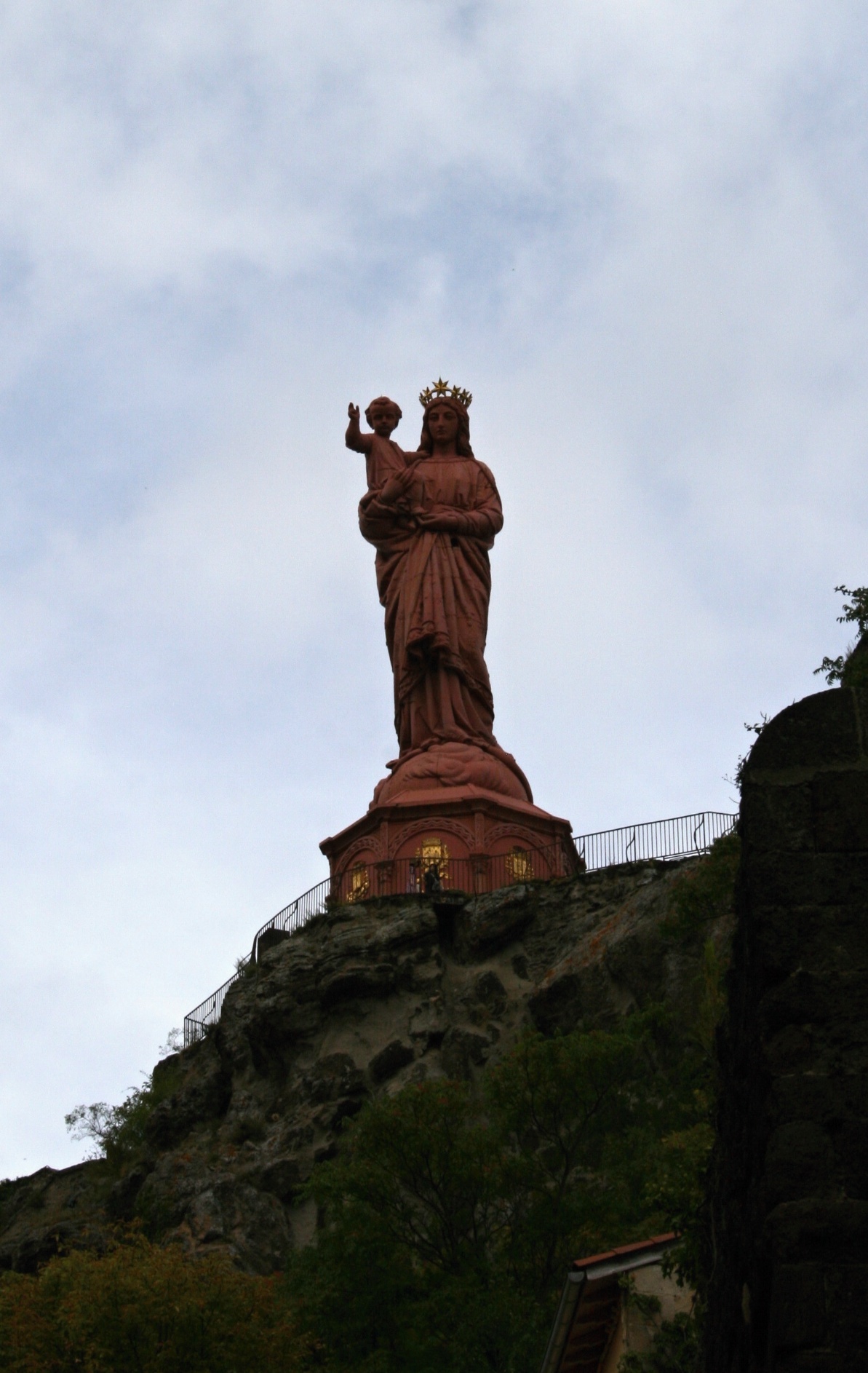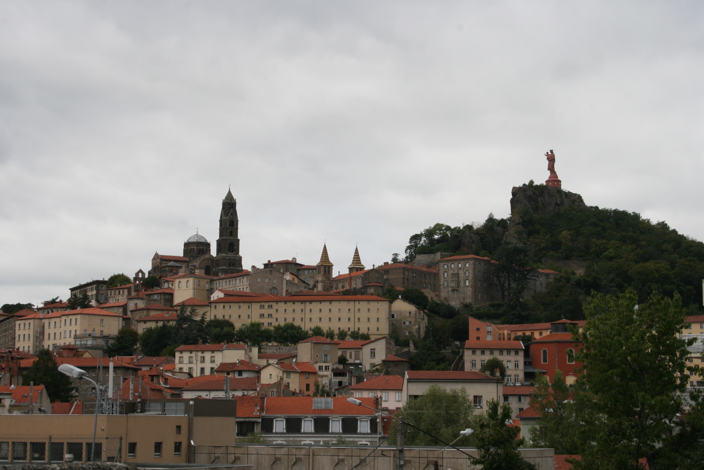 le parking de la gare routière (limité à 24h 8€). Nous n' y resterons que 4 heures, le temps de visiter la vieille ville, la cathédrale et son magnifique cloître. Nous ne ferons pas les deux grandes ascensions du rocher Corneille et de St-Michel d'Aiguilhe . ! En 5 minutes nous sommes place Cadelada qui nous rappelle que Le Puy est aussi la capitale de la verveine. Nous ferons l'ascension jusqu'à la cathédrale par la rue Lafayette puis par la rue Cardinal Polignac bordées de belles demeures colorées et d'hôtels particuliers. La cathédrale Notre-Dame-de-L'Annonciation. De facture romane, la cathédrale Notre-Dame du Puy se dresse au pied du rocher Corneille, un promontoire d'origine volcanique dominé par une statue de la Vierge en acier moulé (provenant des canons pris aux Russes à Sébastopol). Érigée au XIIe siècle, la cathédrale est insolite du fait de la diversité de ses styles, et témoigne de la richesse passée de l'art roman. |