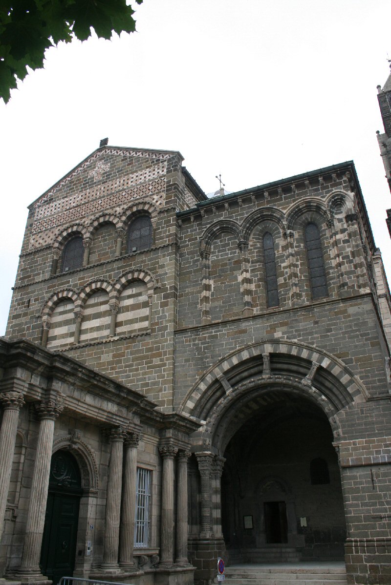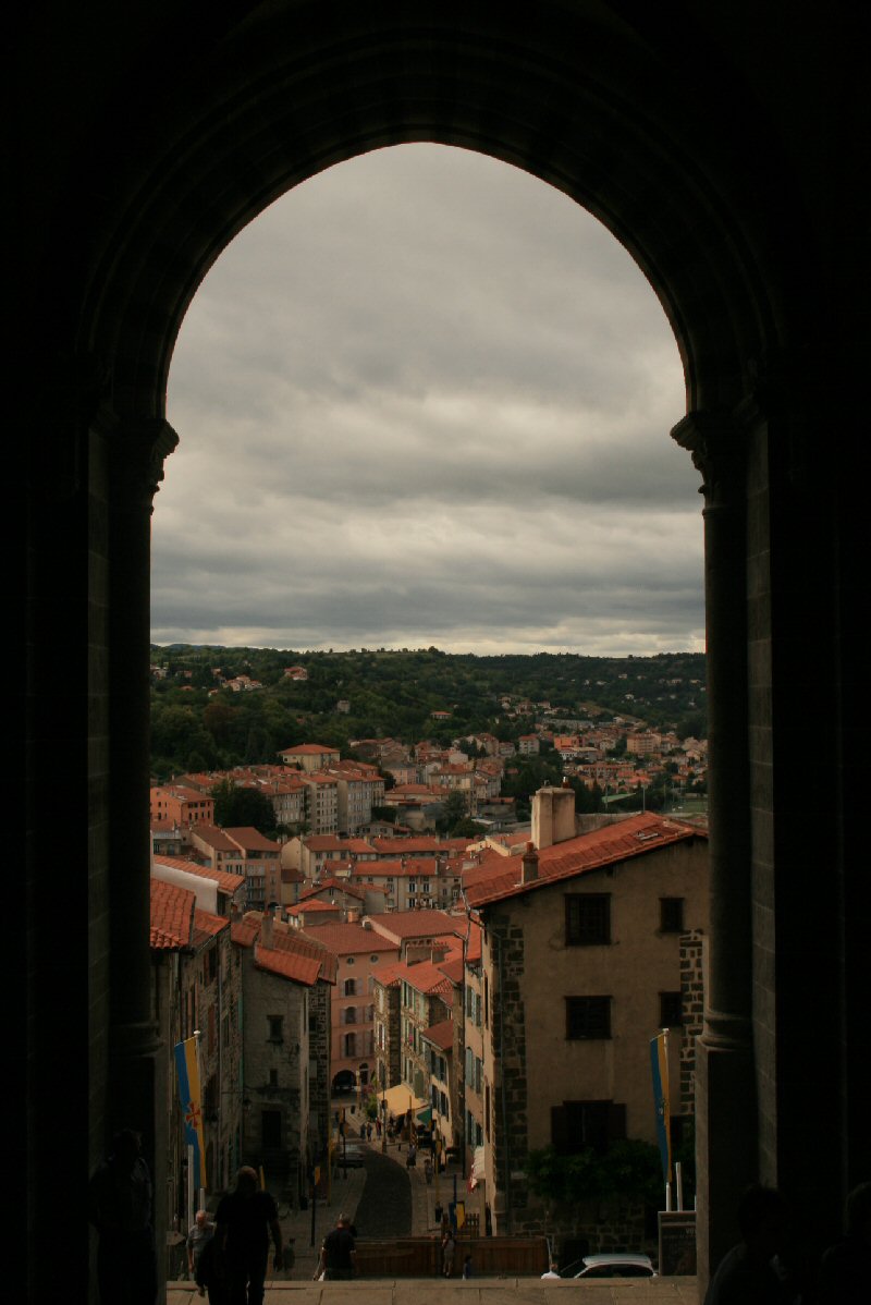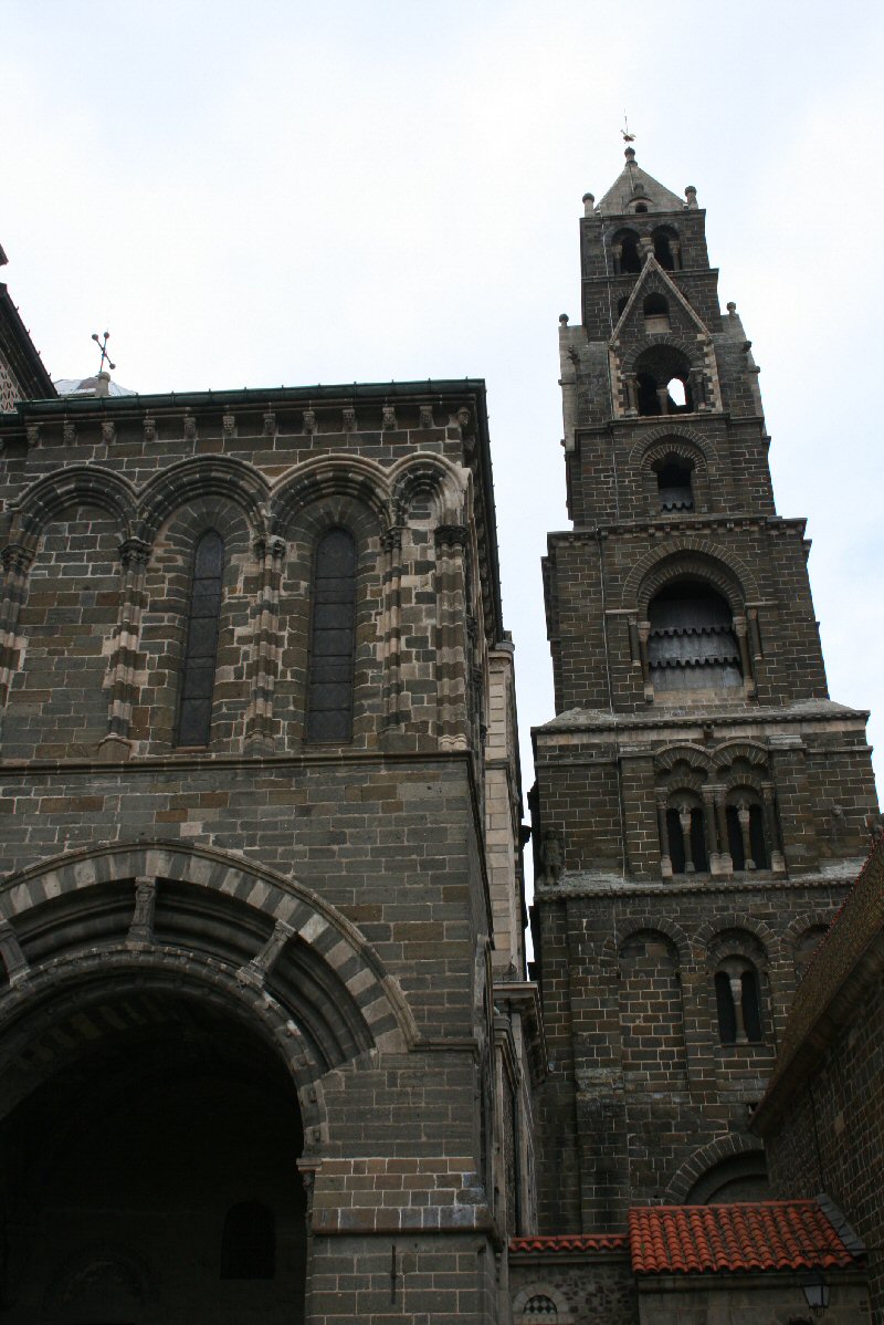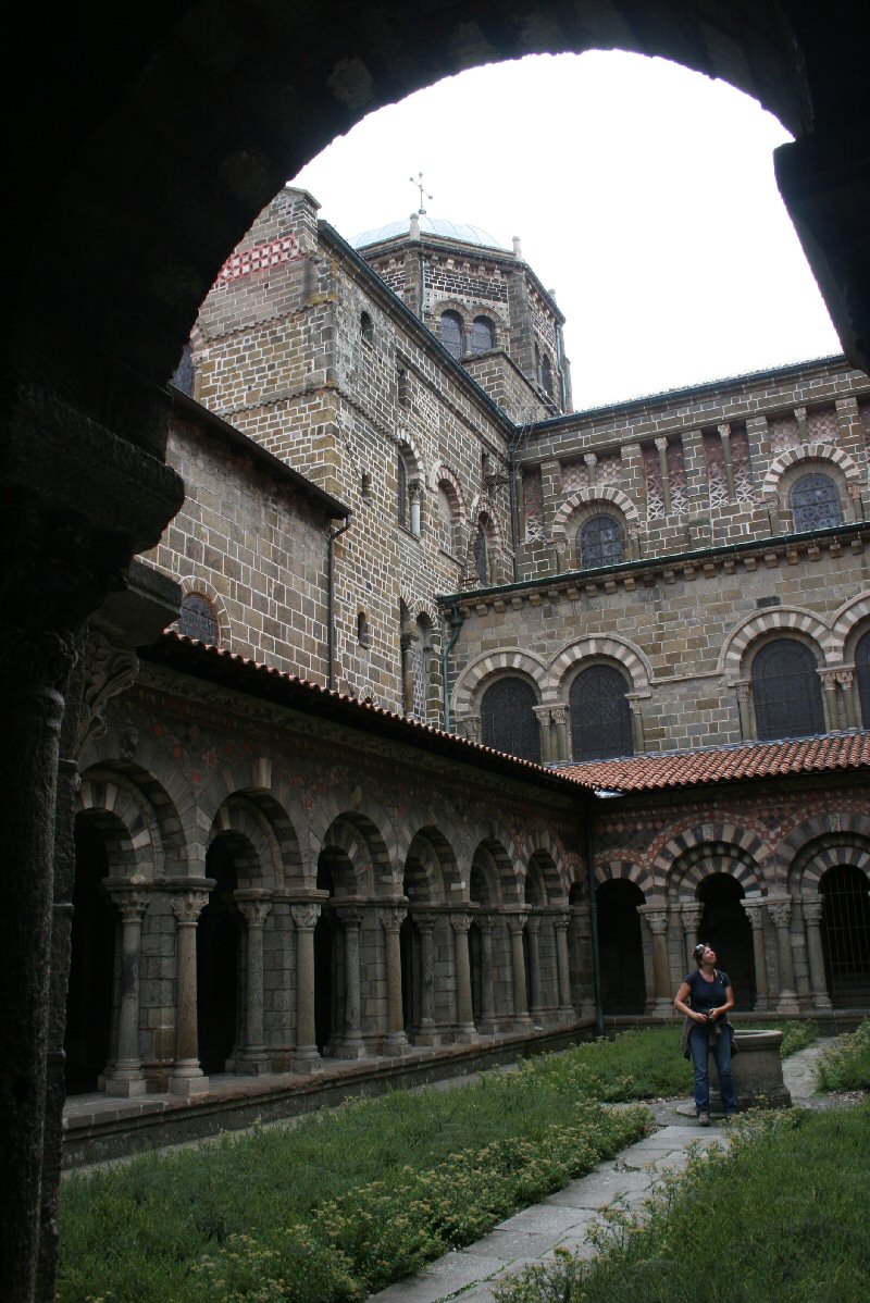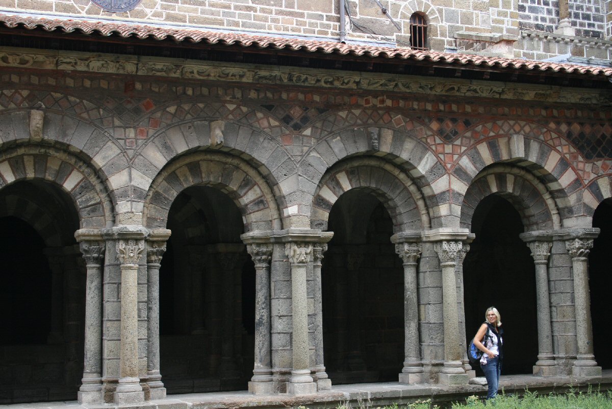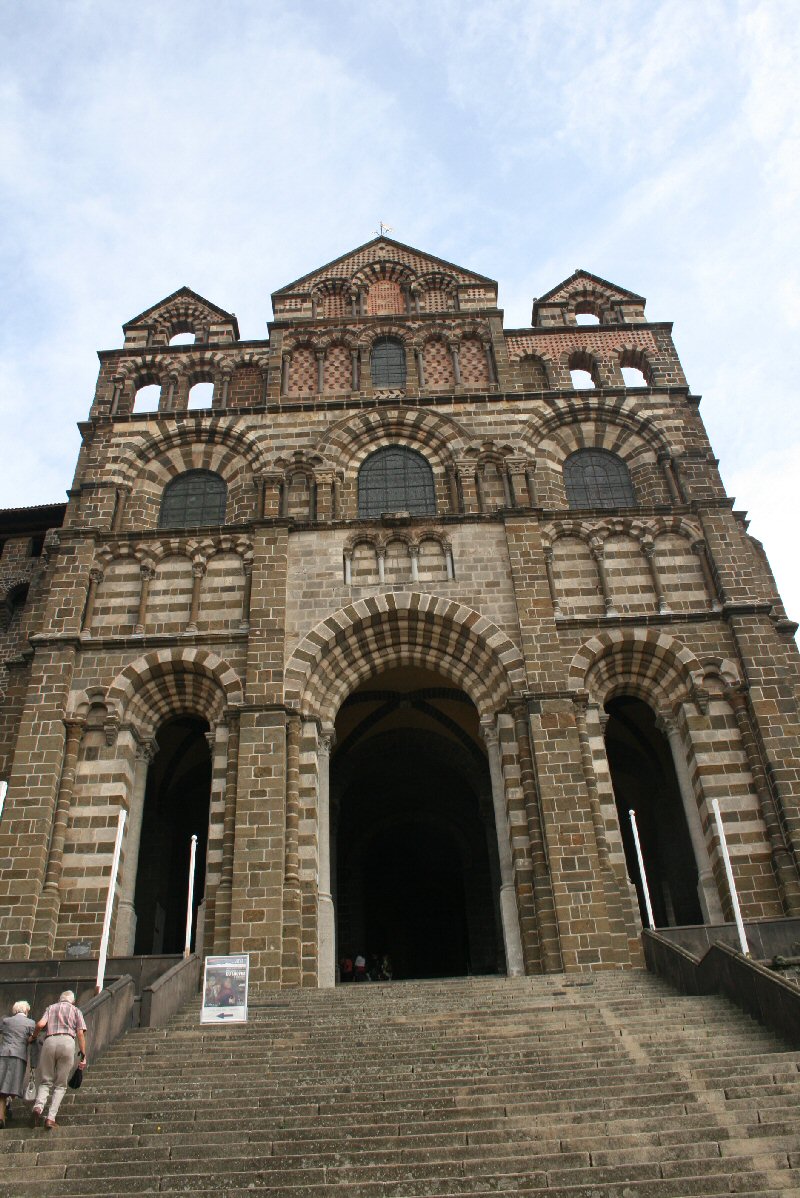 marches. L'aspect oriental de la cathédrale et de nombreux autres édifices de la ville est surprenant. On note une certaine ressemblance entre la mosquée de Cordoue et le cloître du Puy, l'assemblage de matériaux rouges et blancs de là-bas (brique et pierre) se transforme, sur la terre volcanique du Velay, en polychromie noire et blanche (lave et pierre.). Cette influence de l'art arabe est intimement liée à l'histoire de la ville. |
