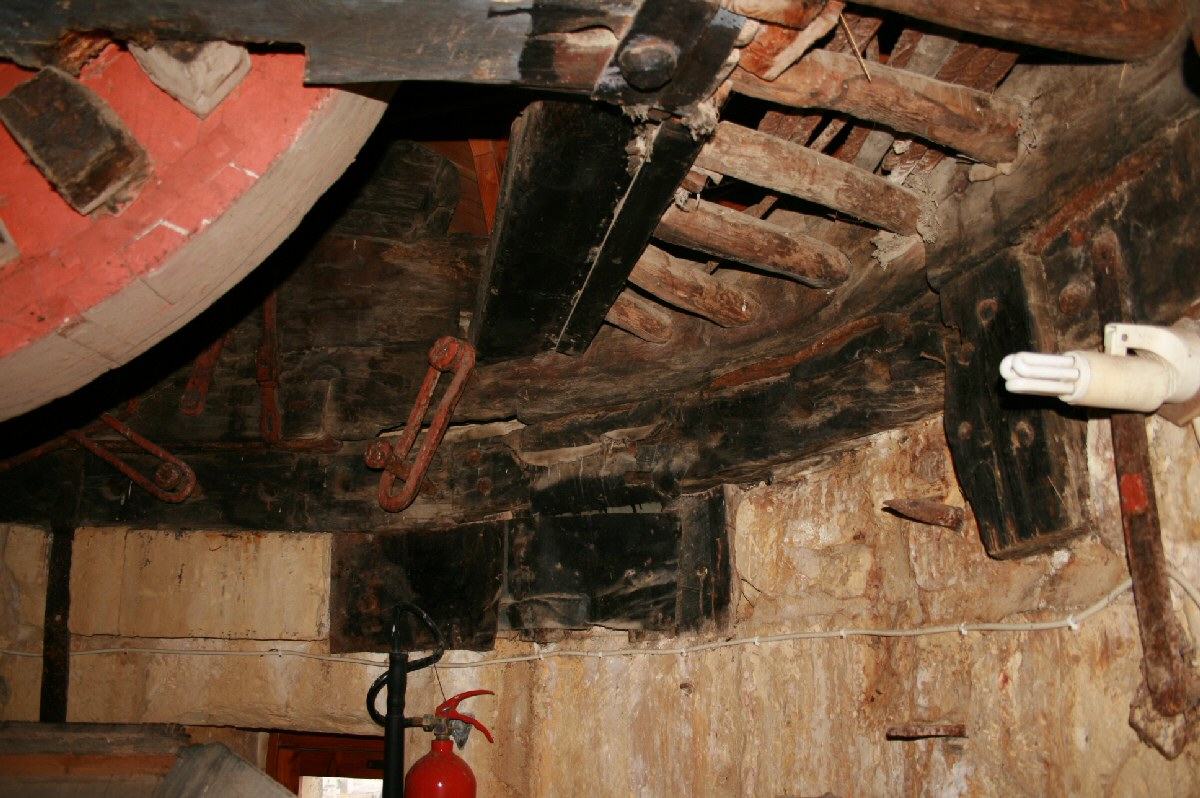 la partie haute du moulin où se trouvent la machinerie et les meules.