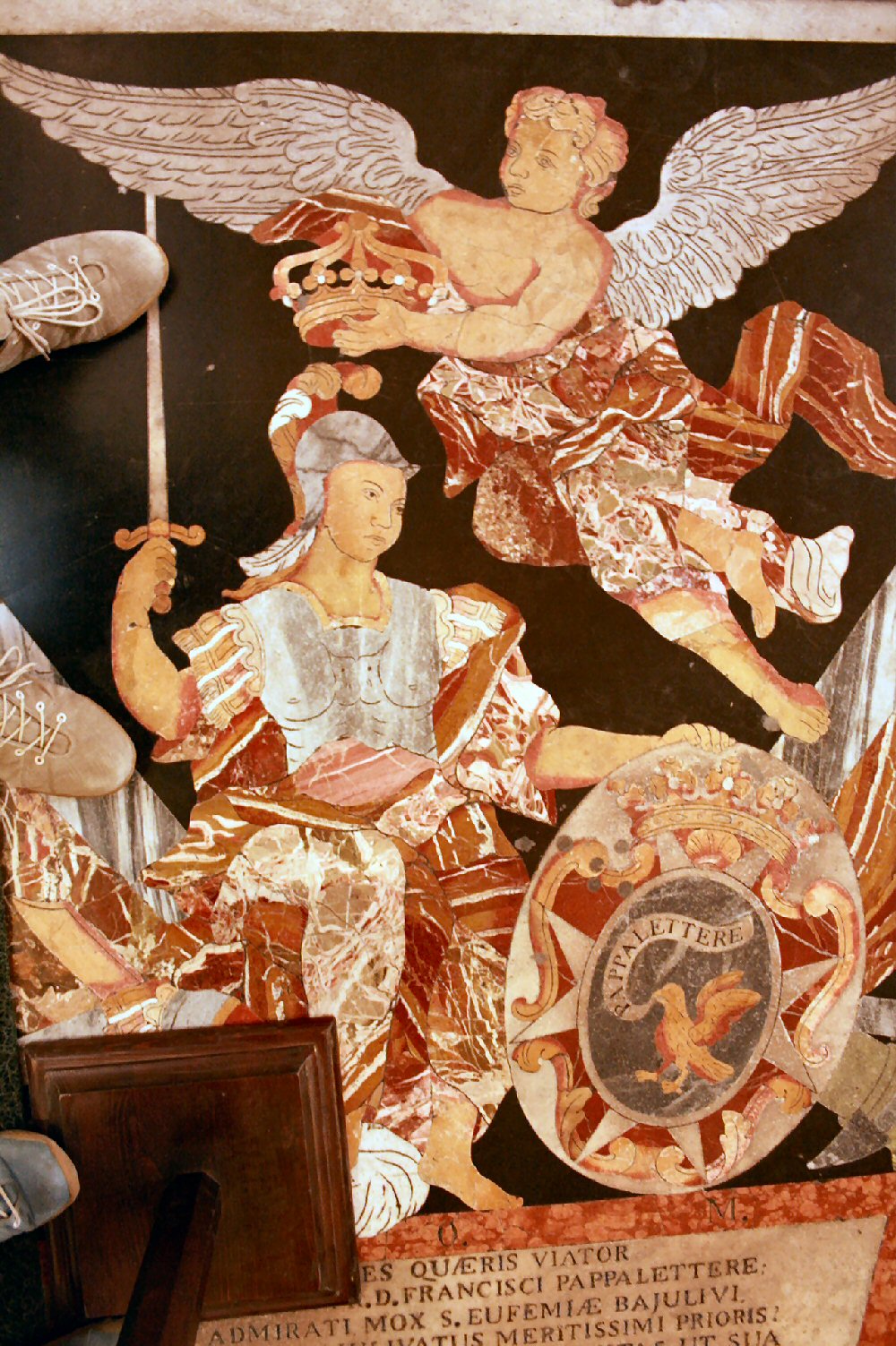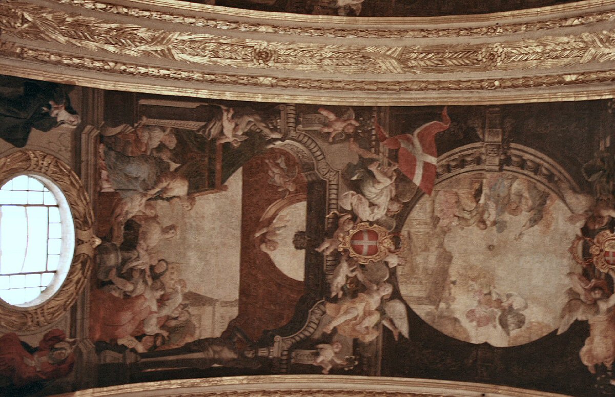 Les somptueuses décorations du pavement répondent à celles de la voûte. La cathédrale est une vaste nécropole : le sol est pavé de 369 pierres tombales en marbre polychrome, sous lesquelles reposent les chevaliers. Les Grands Maîtres eux, gisent dans les sarcophages de la crypte ou dans les magnifiques tombeaux en marbre de leurs chapelles respectives. |