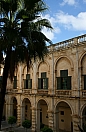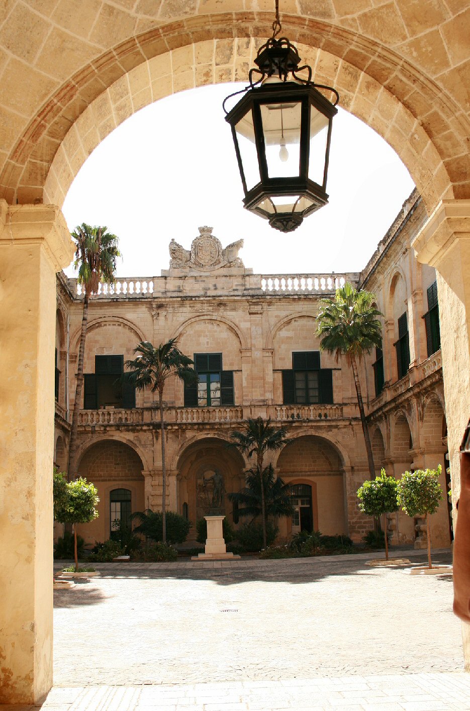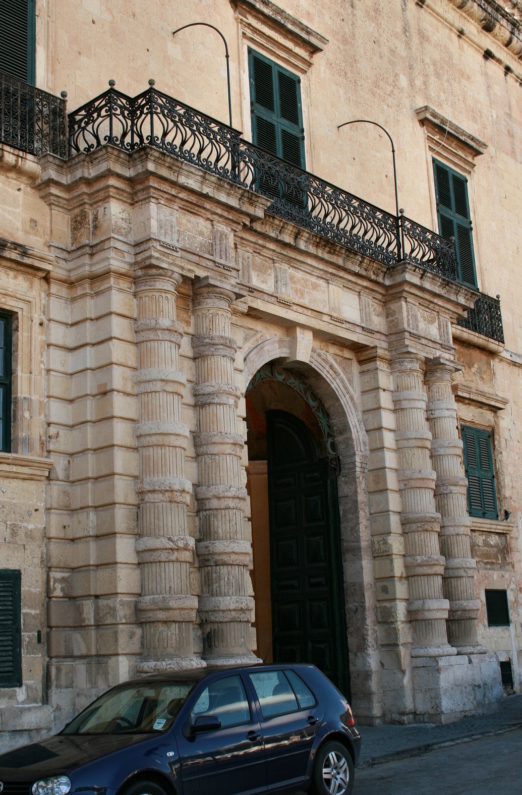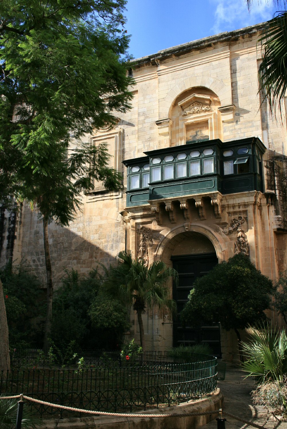 De l'exterieur, le bâtiment trapu et austère montre la volonté de Cassar de transcrire les principes de rigueur et de sobriété de l'Ordre et de rester fidèle à la vocation moilitaire de La Valette. Le Balcon surplombant le portail flanqué de deux colonnes doriques servait à annoncer l'élection du Grand Maître de l'Ordre à la population. Au dessus du porche, les armes du pape Grégoire XIII sont entourées de celles de l'Ordre et du grand maître Jean L'Evesque de la Cassière. |