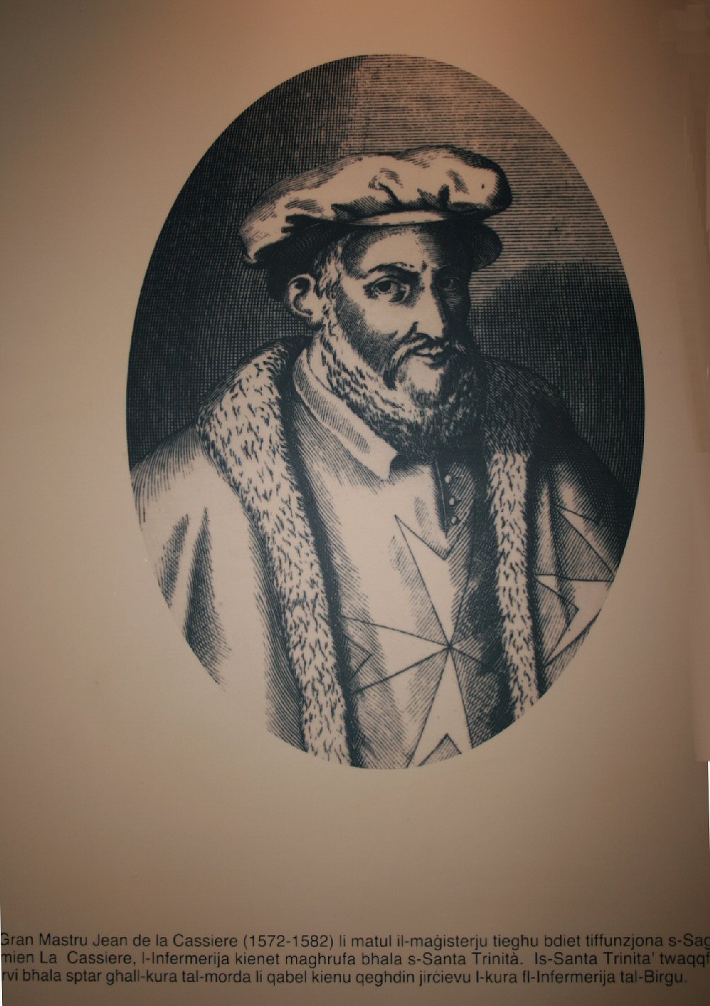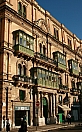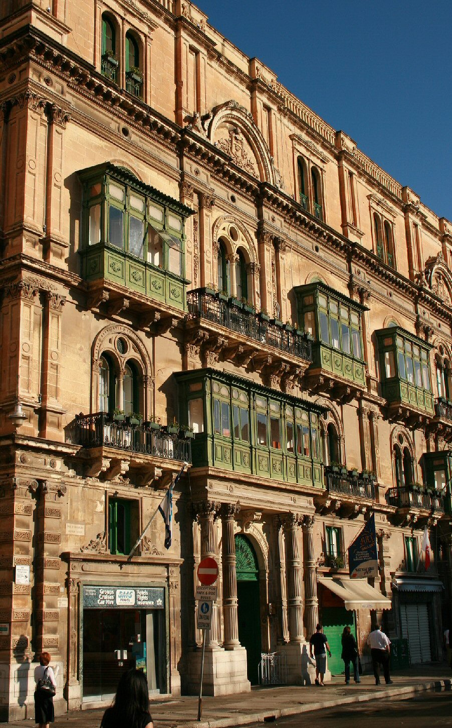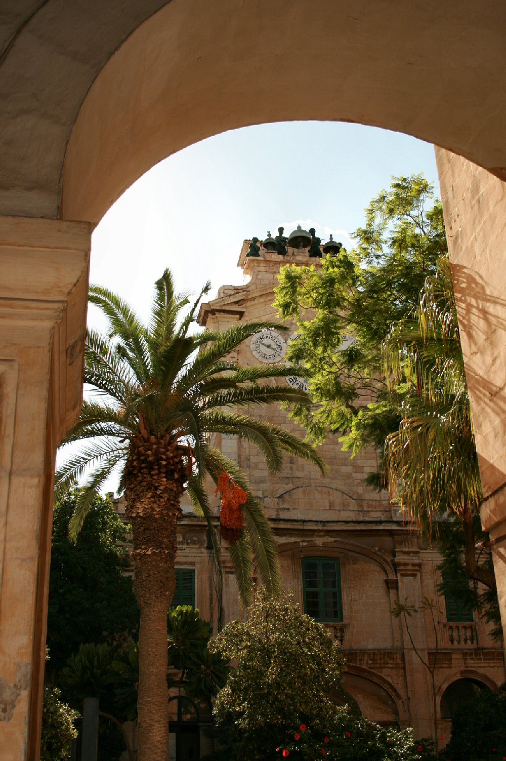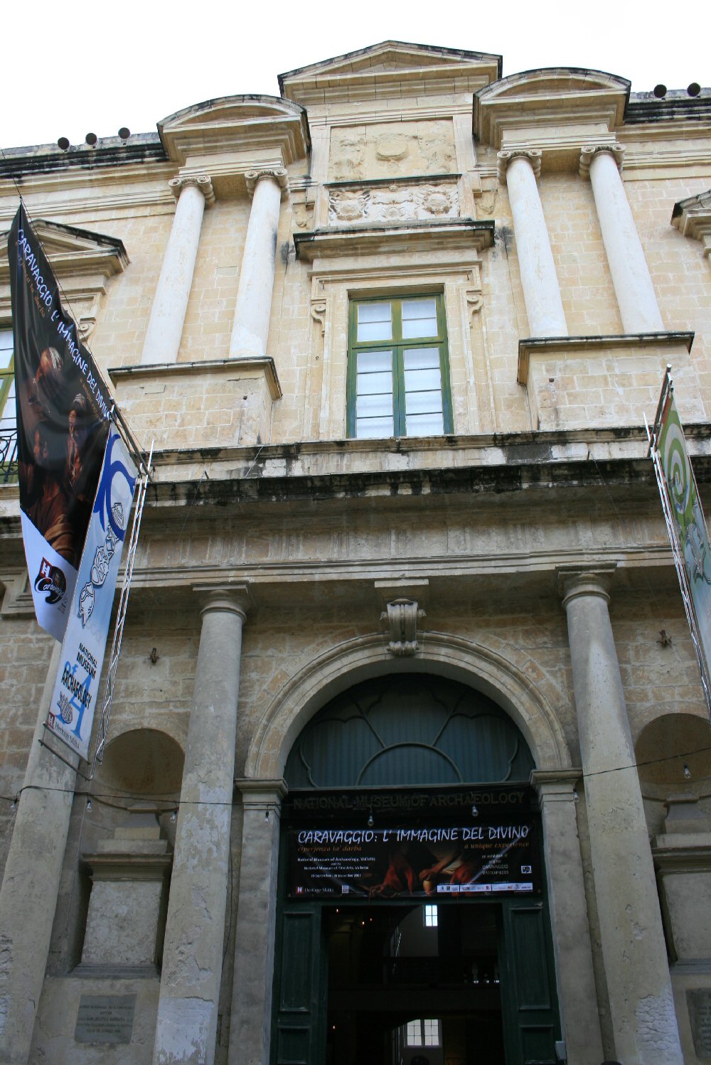 De l'exterieur, le bâtiment trapu et austère montre la volonté de Cassar de transcrire les principes de rigueur et de sobriété de l'Ordre et de rester fidèle à la vocation moilitaire de La Valette. Le Balcon surplombant le portail flanqué de deux colonnes doriques servait à annoncer l'élection du Grand Maître de l'Ordre à la population. Au dessus du porche, les armes du pape Grégoire XIII sont entourées de celles de l'Ordre et du grand maître Jean L'Evesque de la Cassière. |