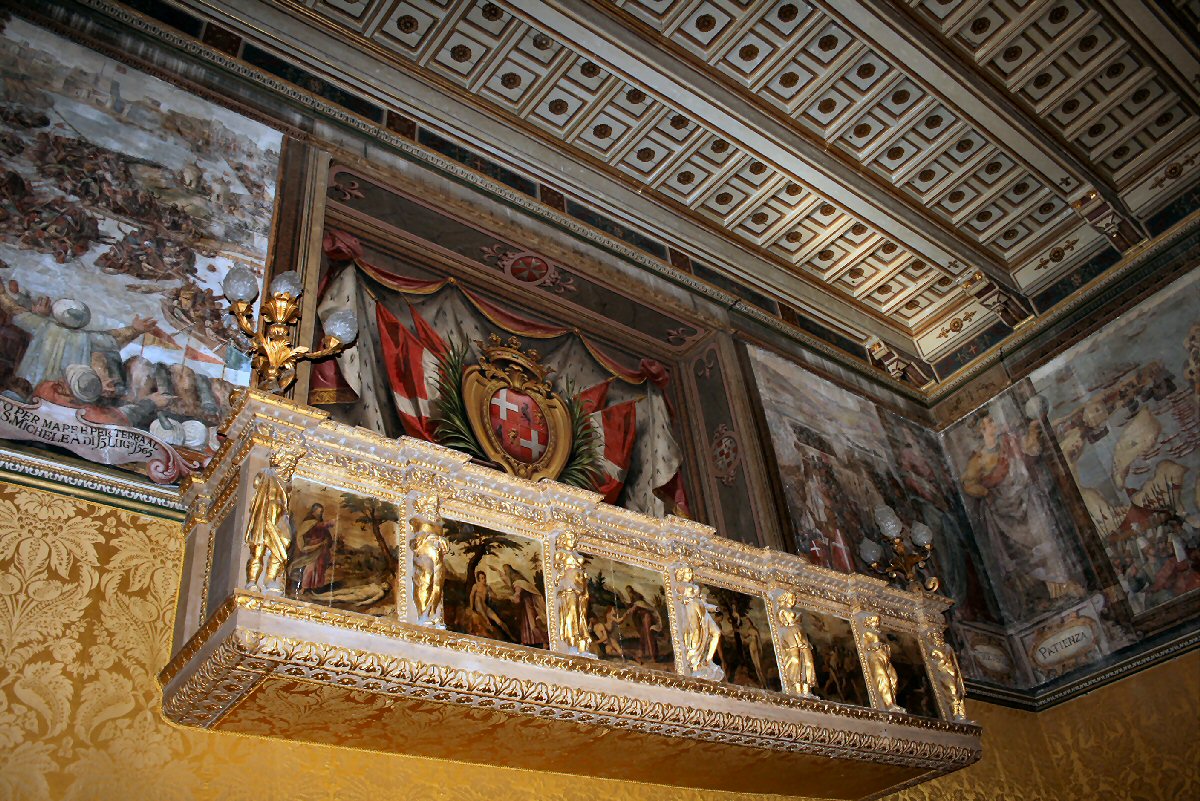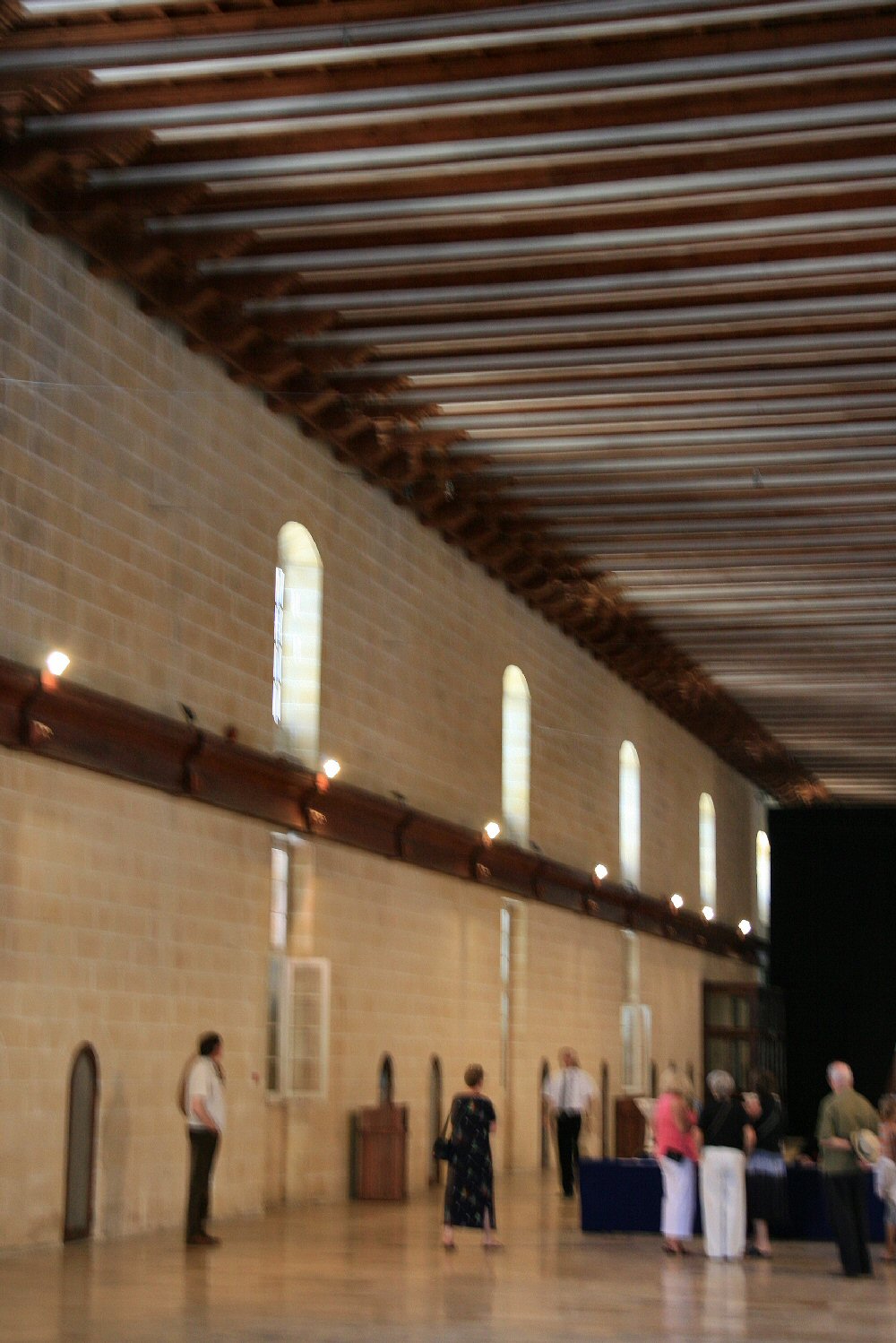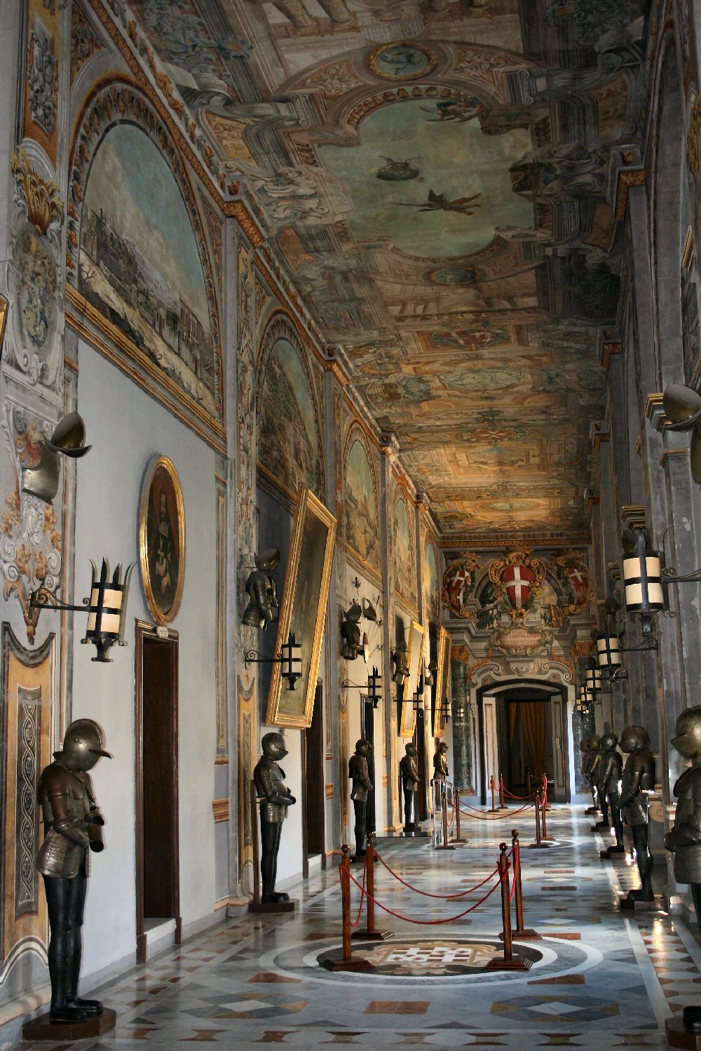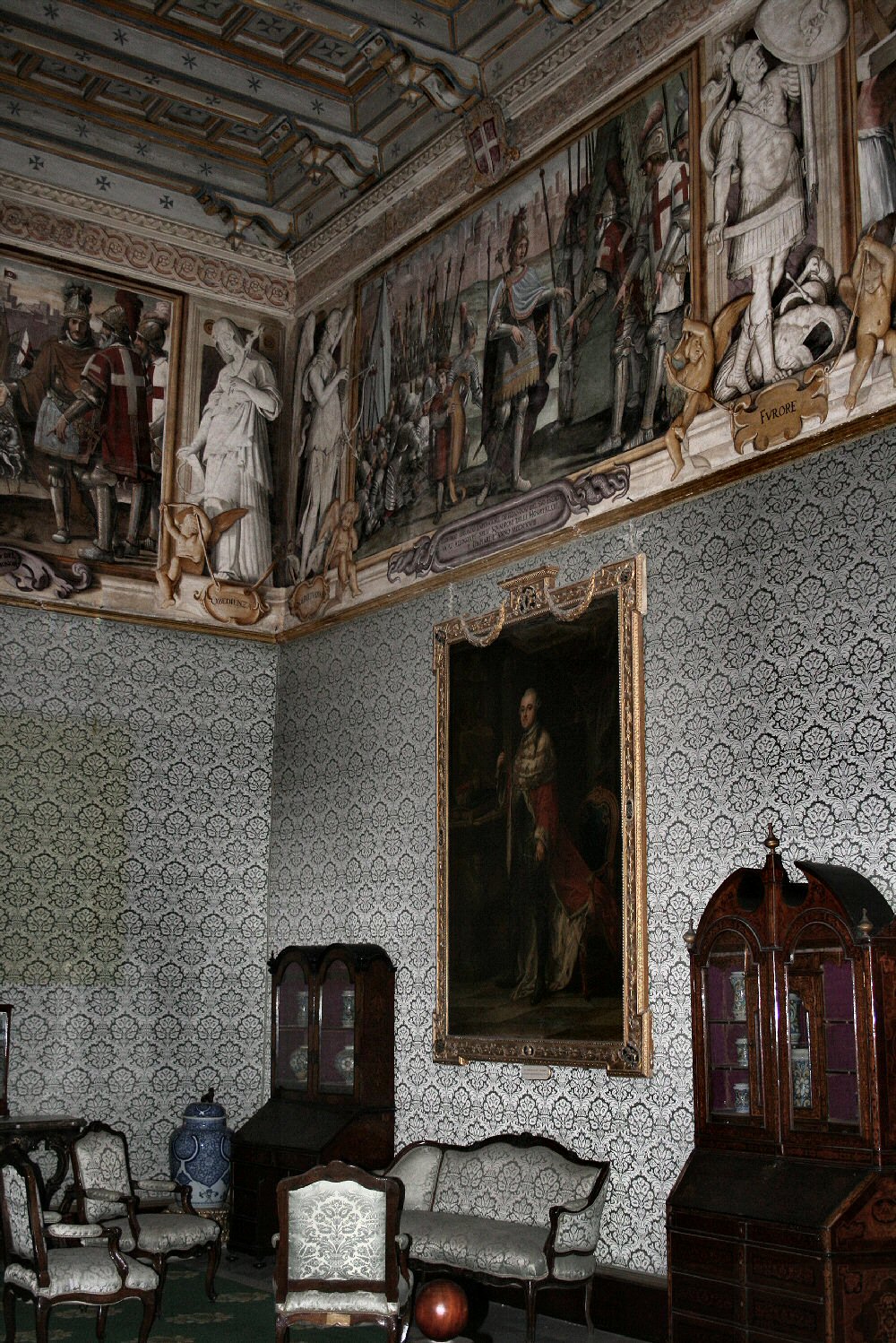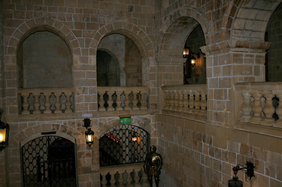 A l’intérieur, le vestibule de l'étage noble donne sur deux couloirs : celui de l’Armurerie réunissant environ 5 700 pièces provenant de toute l’Europe du XVIème à la moitié du XVIIIème siècle et le couloir du Prince de Galles. Ce dernier dessert la salle des Tapisseries des Gobelins (la Chambre du Conseil), la salle du Trône ou salle du Grand Conseil, la chambre Rouge appelée également hall des ambassadeurs (peintures de Van Loo et Cassarino) et enfin la chambre Jaune qui faisait office d'antichambre aux seize pages qui formaient la suite du grand maître. C'est dans cette salle que l'on peut voir le célèbre tableau d'Antoine de Favray : le Grand Maître Jean de la Valette de Parisot |