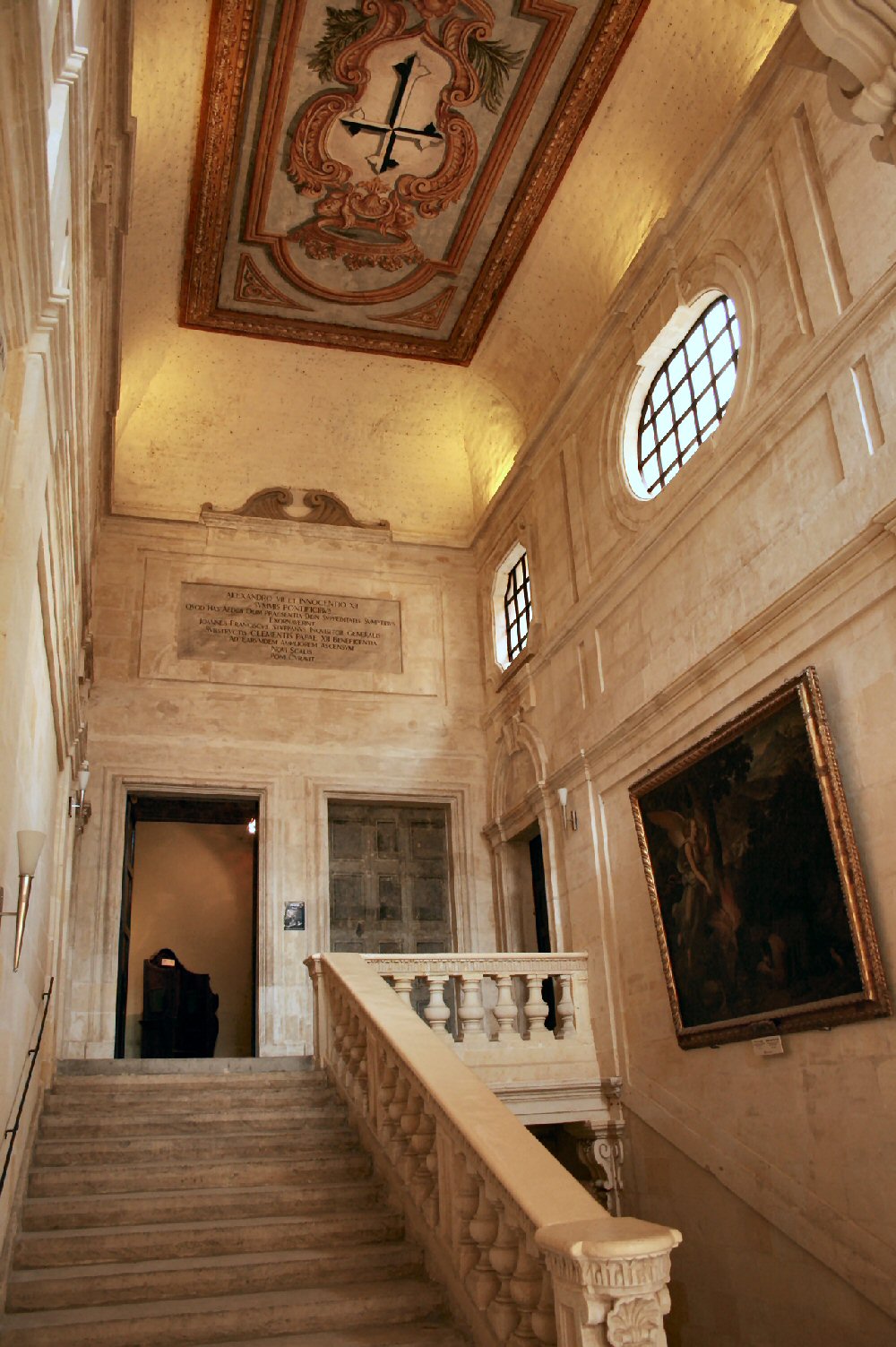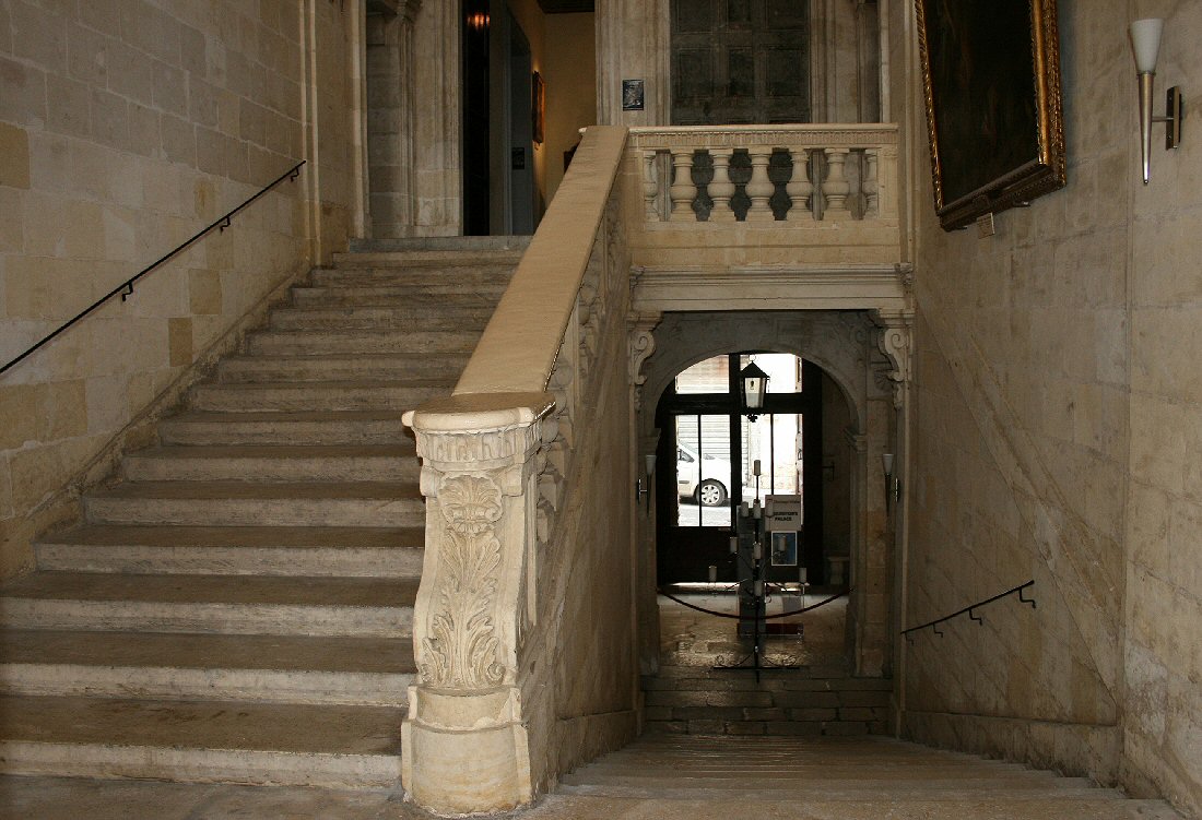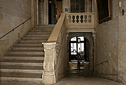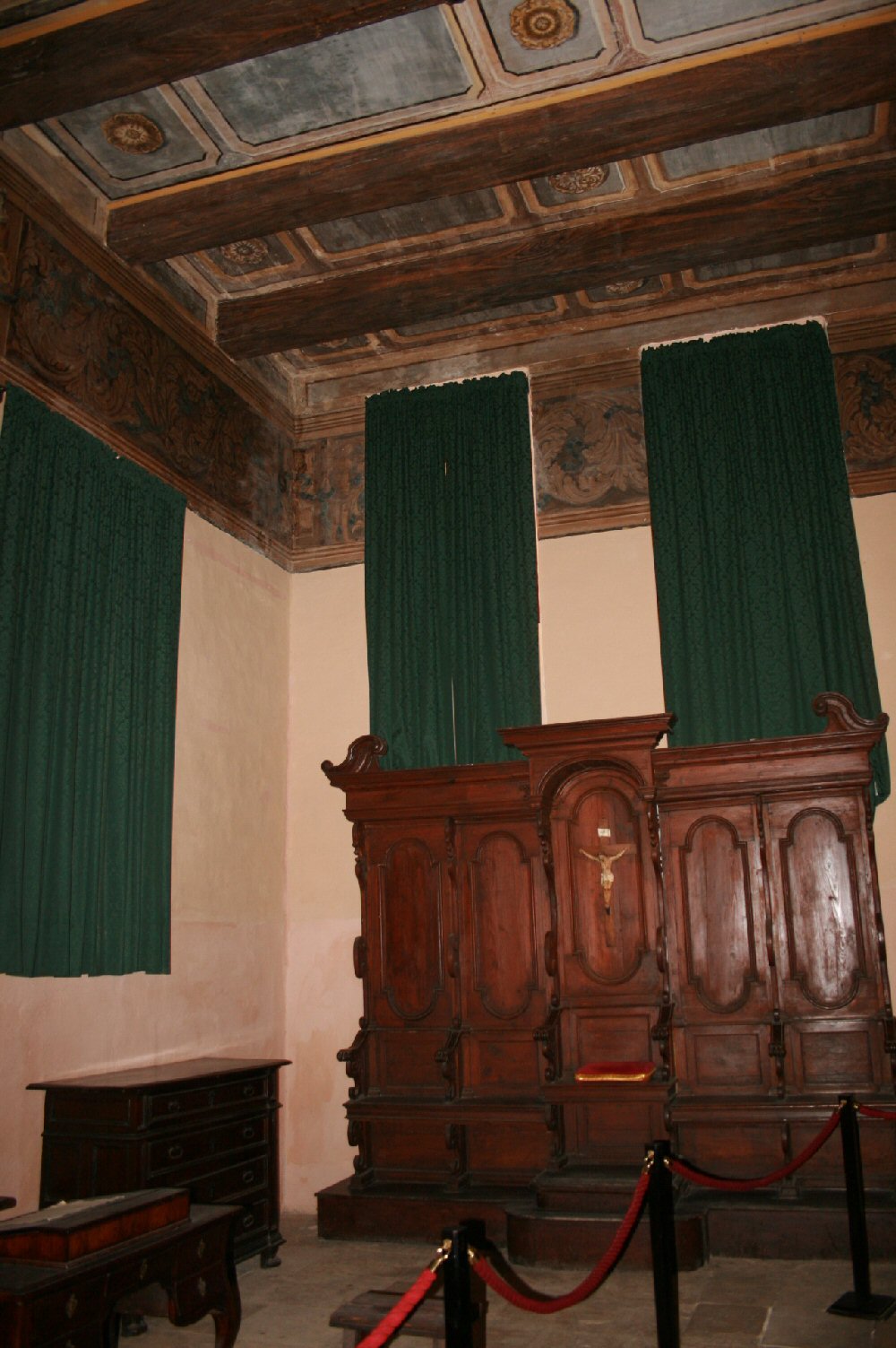 | L'étage noble est desservi par un escalier monumental qui conduit dans l'aile gauche à d'autres geôles et à la maison du gardien et surtout à la Camara secreta, le sinistre tribunal. A droite, dans l'enfilade des pièces, étaient logés les bureaux, l'oratoire privé de l'inquisiteur et ses appartements. |